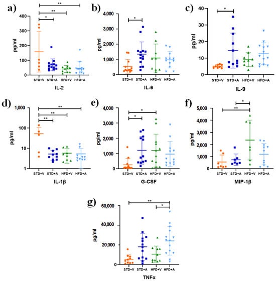 Although the standard group is the reference for the homeostatic response to LPS, the difference in response between the HFD+V and HFD+A groups compared to the STD group is striking. When comparing the effects of diet type on the LPS response, increases in G-CSF (p < 0.04) and MIP-1β (p < 0.009) were observed in the HFD+V group. Meanwhile, compared with those in the HFD+V group, the levels of IL-2 (p < 0.02) (Figure 5a), IL-1β (p < 0.002), and TNF-α (p < 0.001) were significantly lower (Figure 5).