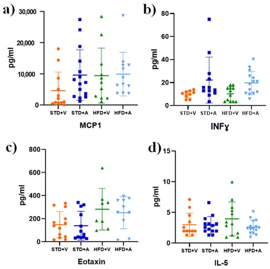 Finally, it is worth mentioning that there were cytokines whose changes were not statistically significant, but whose values showed interesting trends. The mean MCP1 and IFNγ levels were lower in the STD+V group than in the other groups (Figure 6a,b), while the eotaxin levels were comparable to those in the STD+A group (Figure 6c). A final observation is that IL-5 levels were slightly higher in the HFD+V group (Figure 6d). Results are summarized in Figure 7.