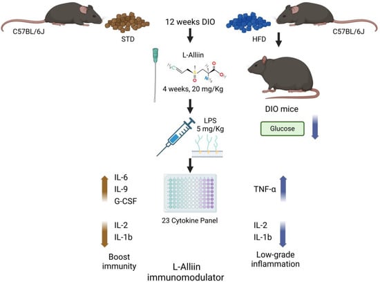 L-Alliin as immunomodulator in both standard diet (STD) and high-fat diet (HFD) obesity-induced (DIO) mice. After 12 weeks of diet, two groups received L-alliin (20 mg/Kg) via a gastric cannula for four weeks. Later, an acute lipopolysaccharide (LPS) stimulus (5 mg/Kg) was administered, and then the glucose levels and serum levels of 23 cytokines were determined. L-Alliin acts as an immunomodulatory molecule by stimulating the release of key molecules in both normal weight and obesity and somehow preventing the release of molecules involved in severe inflammatory response.