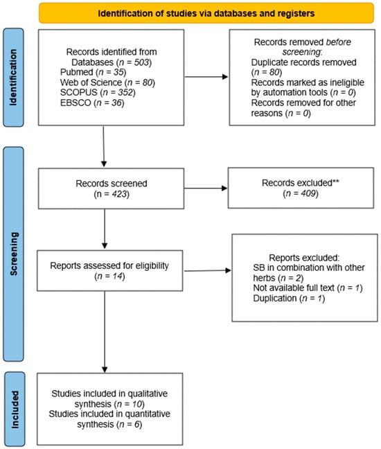 The flow diagram outlining the study selection process is depicted in Figure 1. Our comprehensive search initially identified a total of 503 records across various databases (PubMed: 35, Web of Science: 80, SCOPUS: 352, EBSCO: 36). After removing 80 duplicates, 423 records were screened based on their titles and abstracts against our inclusion criteria. Of these, 409 were excluded for not meeting the criteria, such as irrelevance to the study topic or lack of specific focus on SB. Subsequently, 14 full-text articles were assessed for eligibility. Four studies were excluded for reasons including the use of SB in combination with other herbs (n = 2) [,], lack of availability of full text (n = 1) [], and duplication []. Ultimately, 10 studies were included for qualitative synthesis [,,,,,,,,,], with 6 studies qualifying for inclusion in the quantitative synthesis of the meta-analysis [,,,,,]. Studies such as those by Mabasa et al. [], and Ngueguim et al. [] were not included in the meta-analysis because the data were not entirely visible or well-defined in the graphs, making it impossible to extract the values using the AutoMeris WebPlotDigitizer software (version 5.2 for Windows 10).