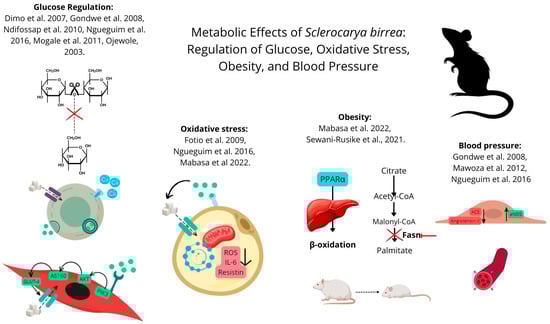 Several studies have investigated the effect of SB on the lipid profile [,,,], showing promising results in the modulation of lipid parameters. Dimo et al. [] reported that SB stem bark methylene chloride/methanol extract significantly reduced plasma cholesterol and triglyceride levels in diabetic rats, particularly at higher doses. Similarly, Ngueguim et al. [] found that SB stem bark aqueous extract decreased total cholesterol levels and abdominal fat in rats fed a high-fat diet, suggesting a beneficial role in managing lipid accumulation. Sewani-Rusike et al. [] showed that SB fruit peel extract led to a reduction in total cholesterol and visceral fat in rats with diet-induced obesity, although triglycerides and LDL cholesterol levels remained elevated, indicating a selective lipid-lowering effect. Mabasa et al. [] noted a reduction in liver weight and hepatic steatosis in db/db mice treated with SB, along with a downregulation of Fasn, a gene involved in lipid synthesis, suggesting that SB may influence lipid metabolism at the genetic level. These studies collectively highlight the potential role of various SB extracts in modulating lipid profiles, particularly by reducing cholesterol and other lipid accumulations in different animal models of metabolic dysfunction.