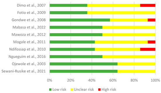 Risk of bias assessment across 10 studies [,,,,,,,,,].