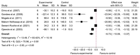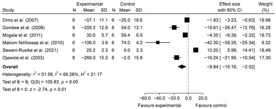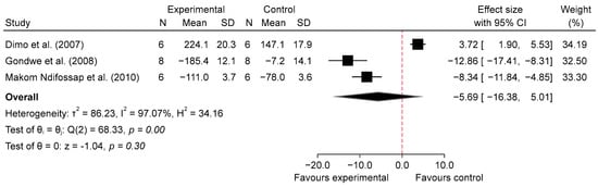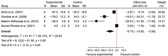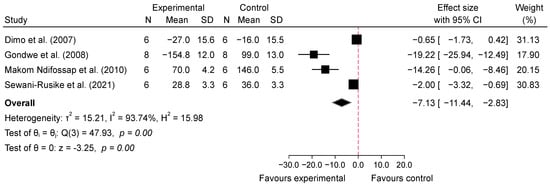 In this case, meta-analysis was conducted for the chronic effects of SB using low doses [,,], as specified in the methodology, meta-analyses were only performed when there were three or more studies with usable data. This analysis, focusing on the chronic administration of SB over 5 to 6 weeks at doses ranging from 120 to 150 mg/kg, revealed a non-significant overall effect on blood glucose levels in diabetic rats. The overall pooled SMD was −5.69 (95% CI: −16.38 to 5.01, p = 0.30, I2 = 97.07%; Figure 8), indicating no statistically significant reduction in blood glucose levels compared to the diabetic control group. The high heterogeneity observed (I2 = 97.07%) suggests substantial variability among the included studies, which may be due to differences in experimental designs, dosage regimens, or biological responses.