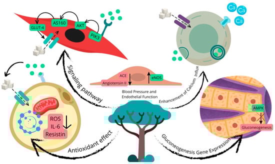 Hypothesized metabolic effects of SB in animal models [,,,,,,,,,]. SB may affect metabolic health through various pathways. In glucose metabolism, SB could enhance GLUT-4 translocation in muscle cells and promote insulin secretion in pancreatic β-cells by increasing calcium influx. For cardiovascular health, SB may support vasodilation and blood pressure regulation by increasing nitric oxide production via eNOS activation and inhibiting ACE activity. Additionally, SB may reduce inflammation by lowering pro-inflammatory cytokines like IL-6 and resistin in adipocytes, as well as decrease oxidative stress through its antioxidant effects. In the liver, SB might inhibit gluconeogenesis via AMPK activation, contributing to improved glycemic control.