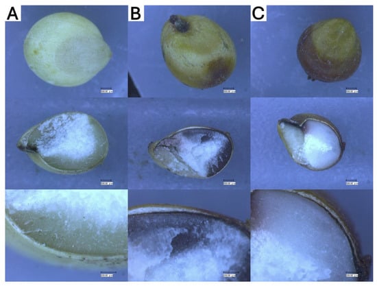 Microscopic observation of sorghum grains to represent the grains’ appearance as well as the presence of pigmented testa, thickness of pericarp, and secondary color. (A) TDN® Sorgho, (B) Mini Sorgho, and (C) RILN-156. Scale 500.00 μm for the first and second lines and 500.00 μm for the third line (close-up images of the grains’ pigmented testa).
