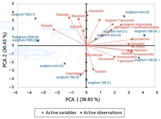As for the flavonoid influences in each sorghum, on the biplot with the variables, it can be observed that the TDN® Sorgho samples were strongly associated with galangin, malvidin, and baicalein. Malvidin was the only anthocyanin that could be identified in this analysis. The flavonoid profile from sorghum mini (1), (3) and (4), and RILN-156 (4) is strongly influenced by apigenin-7-glucoside, naringenin-7-neohesperidoside, and apigenin-8-glucoside. Mini Sorgho (2) is associated with flavonoids like liquiritigenin, similar to RILN-156 (2), which eriodictyol also influences. As for the last two RILN-156 samples, RILN-156 (1) is associated with taxifolin but not strongly characterized by any other variables, while RILN-156 (3) is influenced by variables such as chrysin, formononetin-7-rhamnoside, and epicatechin.
