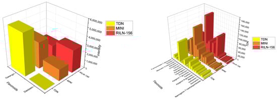 The three varieties differed in grain color, size, and shape. Thus, grains of the uncolored sorghum variety TDN® were larger (length: 4.5 ± 0.28 mm, width: 4.0 ± 0.17 mm) than those of the colored ones (RILN-156 and MINI). The grains of the RILN-156 variety with the most intense color had the smallest sizes (3.5 ± 0.5 mm, 3.0 ± 0.7 mm). The dimensions (4.0 ± 0.5 mm, 3.5 ± 0.5 mm) and color of the MINI variety grains occupied an intermediate position. The size of the grains were positively proportional to the size of the crops.