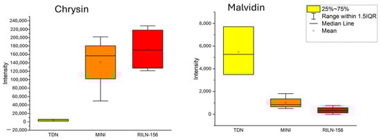 Correspondingly, except for flavonols and anthocyanin, red sorghum varieties presented a more significant intensity in flavonoids overall, indicating a higher concentration. Besides flavonols, Mini Sorgho and RILN-156 had a higher concentration of isoflavones and flavones as well. As mentioned, Taxifolin, representing the dihydroflavonols, was also outstanding in one of the RILN-156 samples. According to the concentrations observed by intensity values on untargeted metabolomics, galangin had the highest concentration among all the flavonoids. In the present work, galangin prevailed in white sorghum samples. The second most abundant flavonoid was daidzein. This isoflavone, however, was almost absent in TDN® Sorgho bran, in contrast with the large amount present in the red sorghum samples.