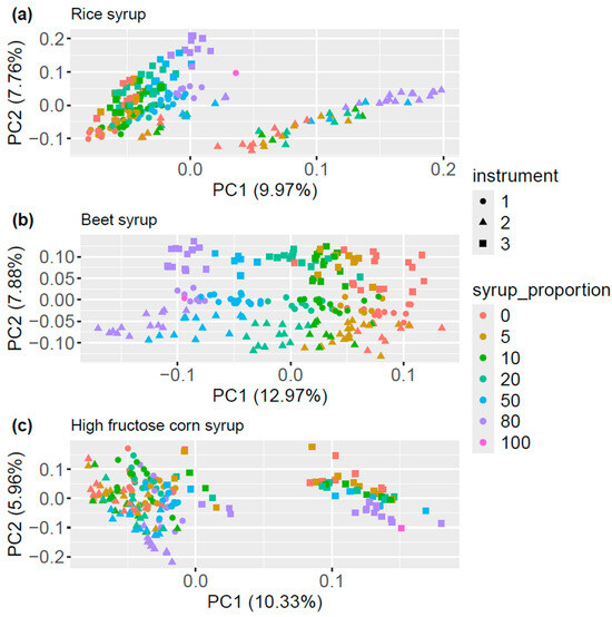 Figure 1 shows the scores plots of the first two principal components of the analysis of the fused data set of honey samples adulterated with rice (a), beet (b) and high-fructose corn syrup (c). Groupings based on the syrup content can be observed in all three plots. However, an extremely strong influence of the device used is evident, particularly in the scores of the first principal component for the samples adulterated with rice and high-fructose corn syrup and the second principal component for the beet syrup adulteration. Similar results were also obtained when the HILIC and RP data were analyzed individually or when fragment data were added (Figures S1–S5). From this it can be concluded that even after the application of the BOULS data processing approach, device-specific variations were still present in the data to a significant extent. The superposition of these variations with sample-specific variations, which result in a lack of robustness of LC-MS approaches, is generally a well-known challenge when implementing untargeted LC-MS methods in routine laboratories [39,64,65,66]. Therefore, as explained above, LC-MS is currently mainly used either targeted or on a single day by a single device. The processing approach used here nevertheless results in a robust data structure due to the three-dimensional bucketing, which makes it possible to analyze and compare samples over a longer period of time, independent of the processing batch [47].