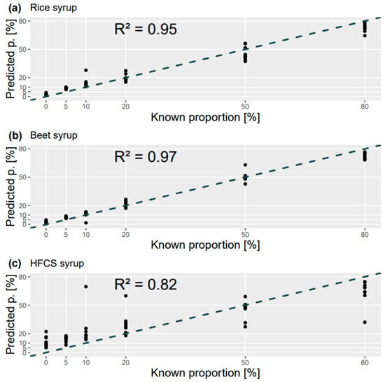 In order to analyze whether the approach could also be used to predict the syrup content, regression models were trained for each syrup adulteration. Figure 2 shows the results for the analysis of the fused data set. The coefficients of determination show values of 0.95 and 0.97 for the analysis of adulteration with rice and beet syrup, respectively (Figure 2a,b). The fact that these values are quite close to 1 shows that there is a relevant correlation between the respective LC-MS data and the actual proportion of syrup present. This makes it possible to predict the syrup content in the test data with an error that is in the single digits, ranging from 2% to 7% for all analyzed proportions (see Figure 2 and Table S7). Again, the results are quite similar whether the HILIC and RP data are analyzed separately or whether fragment data are added (see Table S7). For the prediction of the high-fructose corn syrup proportion, models with coefficients of determination of around 0.8 are obtained (see Figure 2c and Figure S6–S10). The correlation between the respective LC-MS data and the actual percentage of syrup is therefore much lower here than for the analysis of the other syrups. This is also reflected in the prediction of the test data, which shows larger errors ranging from 8% to 22% for the analysis of all data types (see Figure 2 and Table S7). As already surmised in the previous section, this is probably due to the greater similarity of this syrup to the sugars present in honey. In this case, the device-specific variance present in the data set is probably an obstacle to achieving a more precise determination of the syrup proportion.