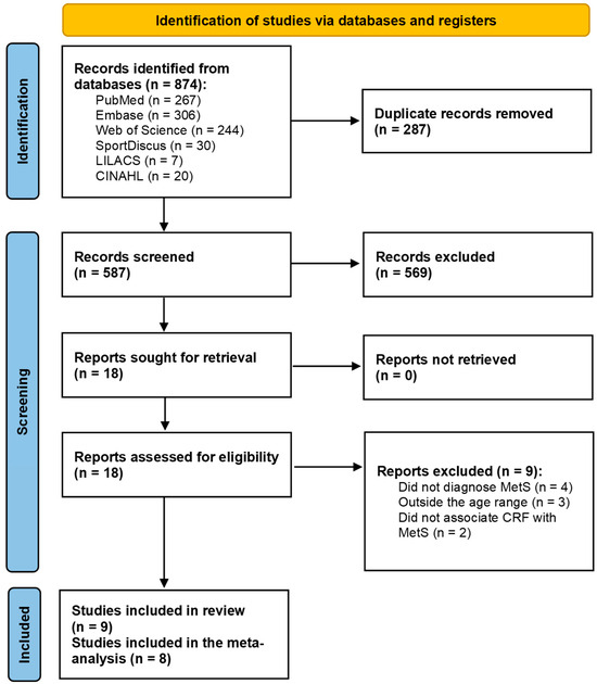 The databases searched were PubMed, Embase, CINAHL, SPORTDiscus, LILACS, and Web of Science, without filtering for publication date and language. The search was last updated on 20 August 2024. The following descriptors were used for searching: (“metabolic syndrome” OR “metabolic syndrome x” OR “syndrome x”) AND (“cardiorespiratory fitness” OR “cardiorespiratory endurance” OR “cardiorespiratory test” OR “aerobic fitness”) AND (“adolescent” OR “youth” OR “teen” OR “teenager”). The complete search strategy used in each database can be accessed in the Supplementary Material. The references of the included studies were checked in an attempt to locate additional reports.