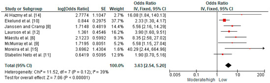 The primary analysis demonstrated a significant association, with high certainty of evidence (Table 2), that low CRF increases the chance of adolescents having MetS by more than three times (OR = 3.63 [CI 95%, 2.54 to 5.20] p < 0.00001, n = 6868, studies = 8, I2 = 39%; Figure 2). Subgroup analysis, which separately verified moderate vs. low CRF (OR = 4.23 [CI 95%, 2.64 to 6.78] p < 0.00001, n = 3861, studies = 5, I2 = 5%) and high vs. low CRF (OR = 8.03 [CI 95%, 3.20 to 20.18] p < 0.00001, n = 3861, studies = 5, I2 = 65%), demonstrated that the chance of adolescents with low CRF having MetS may be four and eight times greater, respectively (Supplementary Figure S1). Subgroup analysis, which sought to separately verify the studies by the type of test used to measure CRF, demonstrated that the significant association with MetS remained, regardless of the test used, with no significant difference (p = 0.51) between the forms of application (Supplementary Figure S2). For the sensitivity analysis that removed one study [12] that did not adjust for possible confounding variables, no change in results was observed. The results also did not change for the other sensitivity analyses when excluding each study one by one and removing the studies with the greatest weight in the meta-analysis.