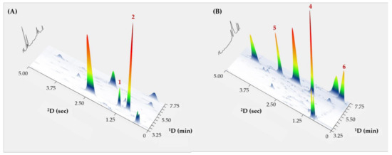 GC×GC−FID extracted 3D plots of selected fortified urine samples. (A) fortified sample number 1; and (B) fortified sample number 6. Peaks: 1, amphetamine; 2, methamphetamine; 4, PVP; 5, ephylone; 6, MDPV.