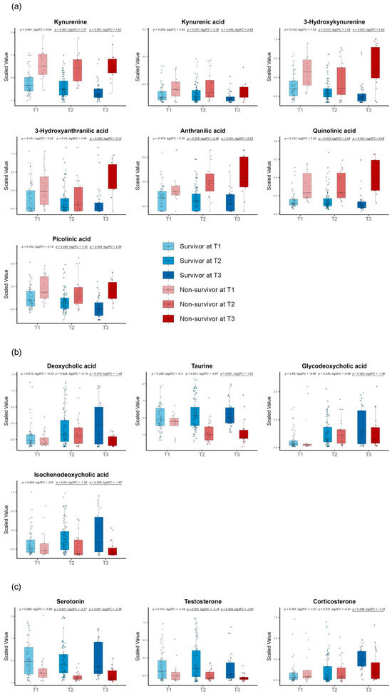 Time−series box plots showing the longitudinal changes in the scaled values of the late−stage differential metabolites and the temporal variation in the significant differences between the survivors and non−survivors across all three time zones. (a) Metabolites from the kynurenine pathway, including kynurenine, kynurenic acid, anthranilic acid, 3−hydroxy kynurenine, 3−hydroxy anthranilic acid, quinolinic acid, and picolinic acid. (b) Bile acid metabolism metabolites, such as deoxycholic acid, taurine, glycodeoxycholic acid, and isochenodeoxycholic acid. (c) Hormones, including serotonin, testosterone, and corticosterone. All p−values were adjusted using the Benjamini−Hochberg method. Underlined numbers met both criteria for differential metabolites: (1) a BH−adjusted p−value of <0.05 and (2) an absolute log2 fold change of >1.