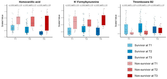 Time−series box plots showing the longitudinal changes in the scaled values of the consistent differential metabolites and the temporal variation in the significant differences between the survivors and non−survivors across all three time zones. The plots show homovanillic acid, N′−formyl kynurenine, and thromboxane B2. All p−values were adjusted using the Benjamini−Hochberg method. Underlined numbers met both criteria for differential metabolites: (1) a BH−adjusted p−value of <0.05 and (2) an absolute log2 fold change of >1.