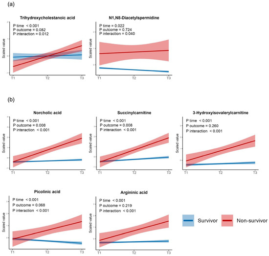 To assess the differences in the trajectories of the DM levels between the survivors and non-survivors, we performed a linear mixed-model analysis and identified two early-stage DMs with significant trend differences: trihydroxy cholestanoic acid and N1, N8-diacetyl spermidine. Additionally, 38 late-stage DMs also showed significant trend differences. Of these, the top five metabolites ranked by their adjusted p-values were norcholic acid, succinyl carnitine, 3-hydroxyisovalerylcarnitine, picolinic acid, and argininic acid. In contrast, no metabolites showed significant trend differences among the consistent DMs (Figure 8a,b for the early- and late-stage DM categories, respectively). Moreover, we found 41 metabolites that were significantly associated with ICU mortality after adjusting for age, sex, the time zones, and the interactions between the time zones and metabolite levels. The results of the linear mixed-model analysis are presented in Table S2.
