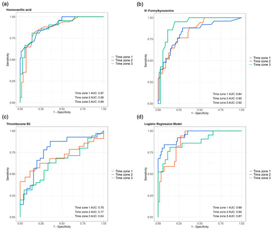 The prognostic abilities of homovanillic acid, N′-formylkynurenine, and thromboxane B2 demonstrated by the areas under the curves (AUCs) of their receiver operating characteristic (ROC) curves across all three time zones: (a) homovanillic acid AUCs: 0.87, 0.90, and 0.89; (b) N′-formylkynurenine AUCs: 0.84, 0.83, and 0.92; and (c) thromboxane B2 AUCs: 0.70, 0.77, and 0.64. (d) The logistic regression model, which incorporated these three metabolites along with the age and sex, showed AUCs of 0.89, 0.95, and 0.87 for time zones 1, 2, and 3, respectively.