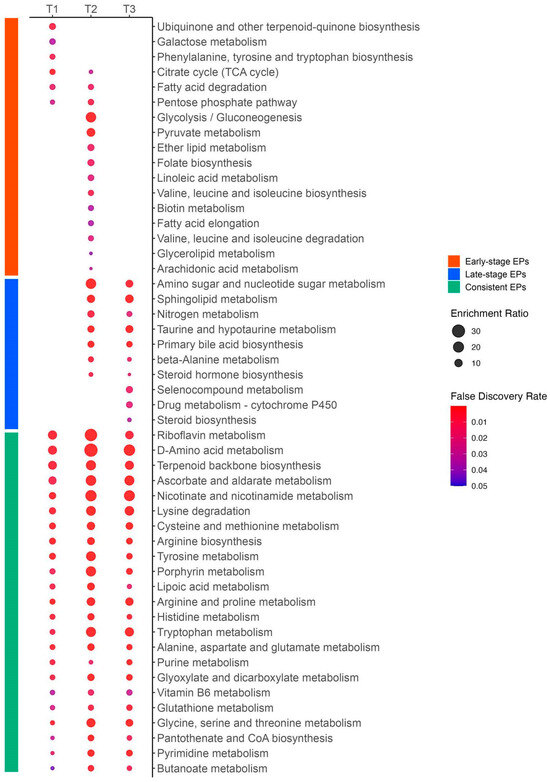 In the late-stage EPs, we observed several pathways related to immunomodulation and inflammation, such as sphingolipid metabolism, taurine and hypotaurine metabolism, and steroid hormone biosynthesis. Moreover, we found nitrogen metabolism and primary bile acid biosynthesis in the late stage.