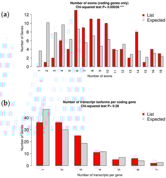 According to the Chi-square test, there was no significant difference in the distribution of query genes across the chromosomes (p = 0.37). The number of exons per gene showed extremely significant (p < 0.01) variations (Figure 2). Findings revealed that the majority of the genes contained six exons and transcribed one to two RNA transcripts. The quantity of transcripts for each gene was also not observed to vary significantly (p > 0.05; Figure 3).