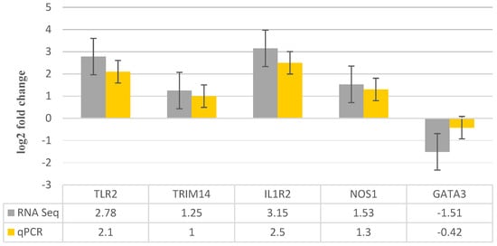 The bar graph depicts the five transcripts that were chosen at random and validated by RT-qPCR. The fold change indicates the variation in transcript amounts between infected and control samples.