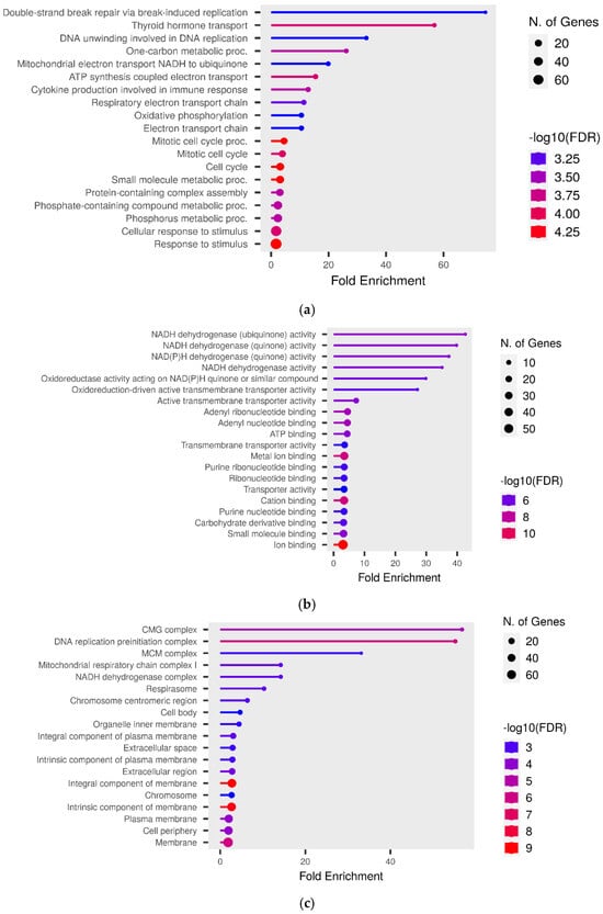 In the context of chicken embryo development, pathway analysis identified several key processes essential for the embryo’s rapid growth and maturation. These processes include chromosome organization, mitosis, DNA replication, mitochondrial activity, and the roles of the CMG (Cdc45-MCM-GINS) and MCM (mini-chromosome maintenance) complexes. These processes are likely crucial in cell cycle and multiplication, occurring rapidly in the developing chicken embryo [98,99]. Numerous publications demonstrated the critical role that mitochondria and mtDNA play in the healthy embryonic development, with an abundant copy number of mtDNA [100,101]. Similarly, pathways of the current study also emphasized that there was increased mitochondrial activity during the embryonic stage, resulting in elevated ATP levels [82]. In chickens infected with MD virus, the ATP (6 and 8) genes, which encode subunits of Complex V, showed increased expression levels. On the other hand, in accordance with our findings, it was found that the ND (1, 2, 3, 4, 4L, 5, and 6) genes, which encode subunits of NADH dehydrogenase (Complex I), exhibited decreased expression levels in lymphoid tissue [73]. The processing, stability, and upkeep of the mitochondrial genome depend on the genes DNA2, MGME1, and SLC25A4. Reduced numbers of mitochondrial copies are often the result of changes in these genes’ transcripts [73,102,103,104,105]. Additionally, research has shown that NDV infection causes mitochondrial damage, which may lead to the downregulation of mtDNA genes [97].