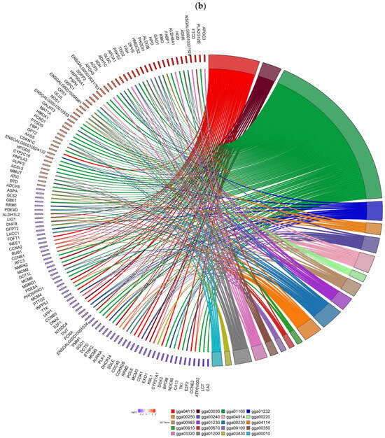Out of a total of 209 genes, 117 were found to be significantly involved (p < 0.05) in 20 KEGG pathways, with fold enrichment ranges from 1.5 to 8.6. Among these, the cell cycle (gga04110), DNA replication (gga03030), and metabolic (gga01100) pathways showed a particularly high level of significance (p < 0.001) and included a greater number of genes (80), all with a low false discovery rate (FDR < 0.001). Additionally, highly significant (p < 0.01) metabolic pathways were identified, including gga01232 (nucleotide metabolism), gga00250 (alanine, aspartate, and glutamate metabolism), gga00240 (pyrimidine metabolism), gga04914 (progesterone-mediated oocyte maturation), gga00220 (arginine biosynthesis), gga00983 (drug metabolism—other enzymes), gga01230 (biosynthesis of amino acids), and gga00230 (purine metabolism). Figure 9 shows the relationship bewteen KEGG terms, genes, and fold enrichment levels.