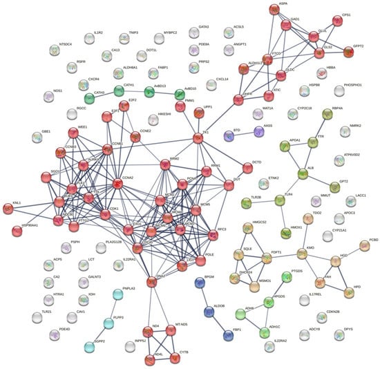 Protein–protein interactions (PPIs) were obtained using the STRING (Search Tool for the Retrieval of Interacting Genes/Proteins) version 12.0 online bioinformatics tool (https://version-12-0.string-db.org/cgi/, accessed on 16 July 2024) [37]. In order to ascertain the functional relationship between the genes related to metabolism, cell cycle, immunity, and mitochondria, DEGs (with corrected p-values of ≤0.05) annotated for the KEGG pathway were utilized to establish a network of close interactions among this gene set based on databases of predicted and experimental protein interactions [37]. We eliminated PPIs based on high confidence ratings of less than 0.7, and disconnected nodes were found. In order to identify a certain number of clusters based on their centroids, k-mean clustering was also performed.