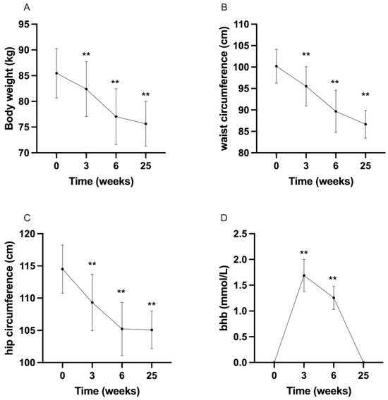Changes in (A) body weight, (B) waist circumference, (C) hip circumference, (D) capillary beta-hydroxybutyrate (BHB) over time. ** p < 0.01.