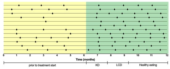 Menstrual cycle frequency of each patient who completed the study in the six months prior to study start and during the study up to the end of follow up. Each horizontal line represents one patient, each vertical line represents one bleeding. KD, ketogenic diet; LCD, low carbohydrate diet.