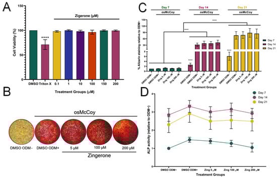 Effect of zingerone on cell viability, mineralisation, and ALP activity in SAOS-2 cells. (A) Zingerone (0.1–200 µM) effects on cell viability (%) of undifferentiated SAOS-2 cells following 48 h treatment. Triton X-100 (0.2%) served as the positive control for cytotoxicity. (B) Mineralisation of SAOS-2 cells treated with zingerone (5–200 µM) for 7–21 days, evaluated using Alizarin Red S staining and measured at 540 nm. (C) SAOS-2 cells treated with osMcCoy media with or without zingerone for 21 days. (D) Zingerone’s effect on ALP activity as a marker of osteoblast-like differentiation measured over three stages of differentiation: 7, 14, and 21 days. Resazurin assay was used to evaluate cell viability. Data presented as mean ± SD (n = 3) (A) or mean ± SEM (C,D) containing at least three independent experiments. **** p < 0.001 (vs. DMSO). Zing: zingerone; DMSO ODM–: undifferentiated media; DMSO ODM+: osteogenic media.