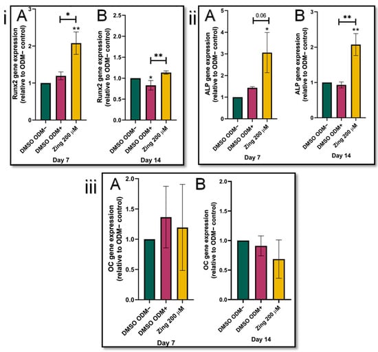 The gene expression of ALP (i), Runx2 (ii), and OC (iii) in SAOS-2 cells treated with 200 µM zingerone for 7 and 14 days of differentiation was assessed by q-PCR. Evaluation of the effects of zingerone on the expression of genes involved in the early and intermediate stages of osteoblast differentiation was conducted by exposing cells to osteogenic media for 7 days (A) and 14 days (B). Data presented as mean ± SD (n = 3), normalised to DMSO ODM–. */** p < 0.05 compared to control (DMSO ODM–). Zing: zingerone; DMSO ODM–: undifferentiated media; DMSO ODM+: osteogenic media.