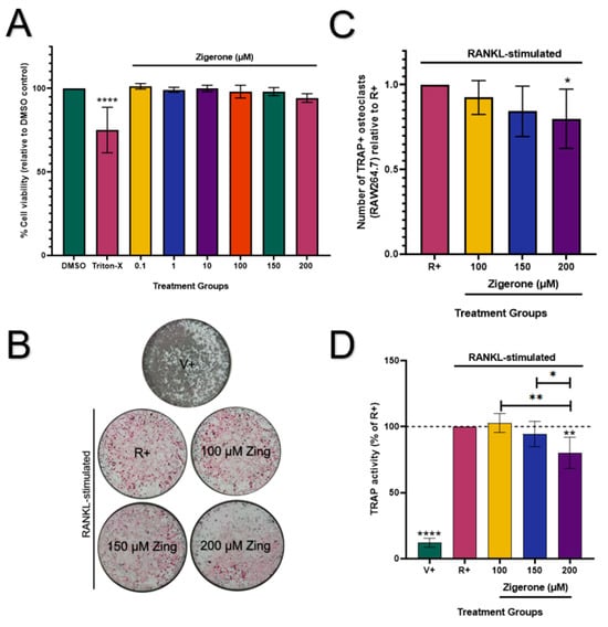 Zingerone (0.1–200 µM) had no cytotoxic effects on RAW264.7 osteoclast-like cells (p > 0.05; Figure 4A) when compared to the vehicle. Therefore, these concentrations were used for downstream experiments. Cells that were not treated with RANKL showed no osteoclast formation (Figure 4B). The number of osteoclasts decreased significantly (20%) in cells treated with 200 µM zingerone when compared to the RANKL-positive cells (R+) (p < 0.05; Figure 4C). Furthermore, TRAP activity was significantly reduced in the absence of RANKL (V+) compared to all treatments (p < 0.0001; Figure 4D). Consistent with the TRAP staining results (Figure 4C), treatment with zingerone (200 µM) resulted in a significant 19.8% decrease in TRAP activity compared to the positive vehicle R+ (p < 0.05; Figure 4D).