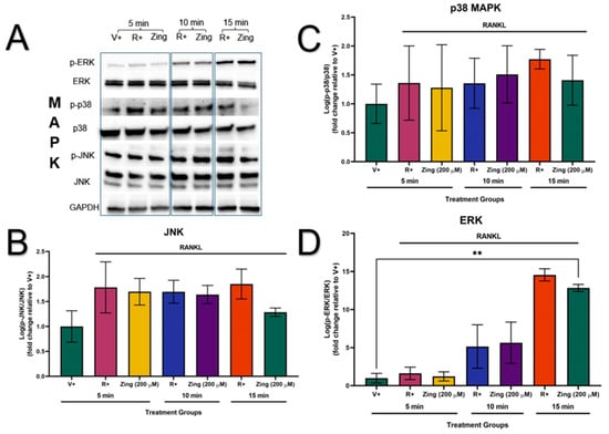 The effects of zingerone (200 µM) on osteoclast-specific protein expression via RANKL-stimulated (15 ng/mL) MAPK (JNK, p38, ERK) signalling pathway. (A) Evaluating the effects of 200 µM zingerone on RANKL-stimulated MAPK signalling as represented by membrane images. GAPDH was used as the control (B–D) The expression levels of MAPKs (JNK, p38, and ERK) in RAW264.7s were treated with 200 µM zingerone and quantified by western blot via cytoplasmic extraction protocol. Data presented as mean ± SD of 3 independent repetitions (n = 3). ** p < 0.05 compared to vehicle control (V+). RANKL: receptor activator of nuclear factor kappa beta; JNK: Jun N-terminal kinase; ERK: extracellular signal-regulated kinase; MAPKs: mitogen-activated protein kinases; GAPDH: glyceraldehyde-3-phosphate dehydrogenase; V+: vehicle control (RANKL not present); R+: RANKL-only stimulated control; Zing: zingerone.