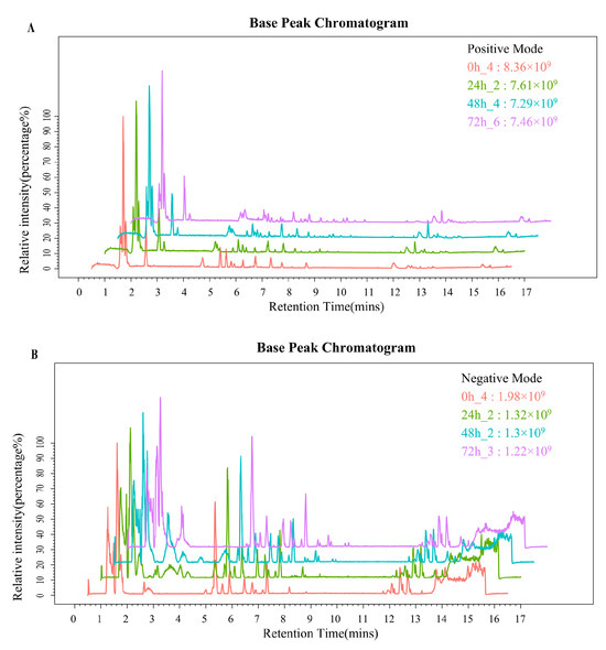 A Base Peak Chromatogram (BPC) was extracted for LC-MS analysis of whey samples collected at the 0 h, 24 h, 48 h, and 72 h fermentation time points (Figure 1). According to the BPC, there were differences in the metabolic profiles among samples from different time points. The intensities of spectral signals demonstrated a clear time-dependent trend, indicating substantial increases in secondary metabolite levels during fermentation. A comprehensive total of 7995 metabolites were identified in the fermented whey samples, with 4909 metabolites detected in ESI+ mode (Figure 1A) and 3086 in ESI- mode (Figure 1B).