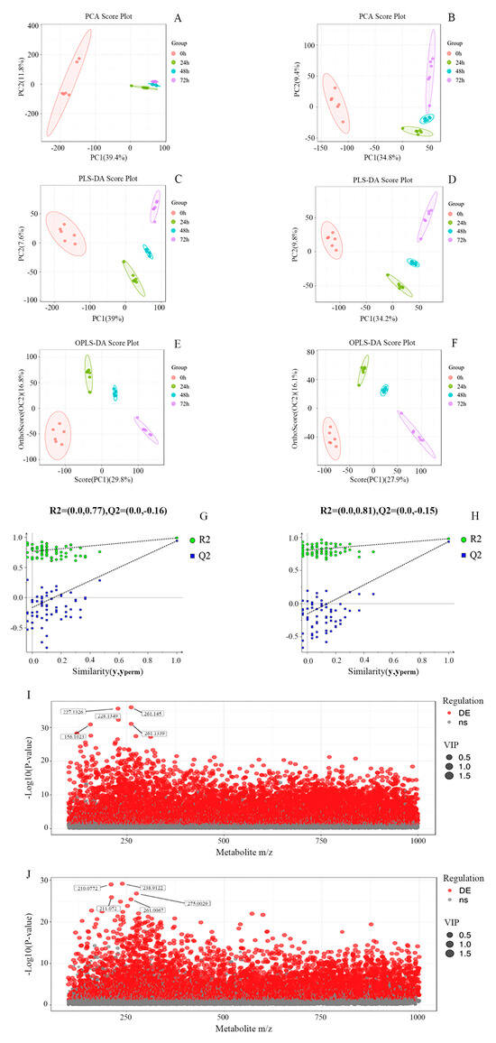 (A−J) PCA score plots (A,B), PLS−DA score plots (C,D), OPLS−DA score plots (E,F), accompanied by permutation tests (G,H), and charge ratio and p value scatter plots (I,J) of whey at different fermentation times in the ESI + mode and in the ESI− mode, respectively (each point in (I,J) denotes one metabolite, with the horizontal coordinates denoting the mass−to−charge ratios of the tertiary substances; the vertical coordinates denoting the p−values of the −log10 of the p value. Larger values of the vertical coordinate indicate more significant differential expression. Red dots represent up−regulated differentially expressed metabolites, grey dots represent metabolites that did not satisfy the filtering parameters, and the size of the dots indicates the VIP value).