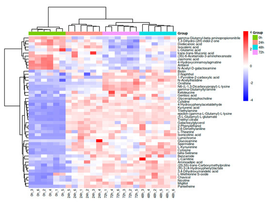 Hierarchical clustering heatmap of differential metabolites of fermented whey at different stages of fermentation (the magnitude of the relative content in the plot is shown by differences in colour, with redder colours showing higher expression and bluer colours showing lower expression).