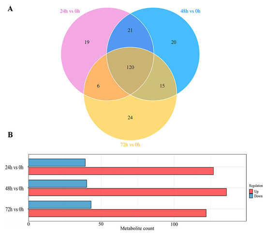 The Venn diagram (Figure 4A) illustrates that a total of 120 differential metabolites were shared among the 24 h versus 0 h, 48 h versus 0 h, and 72 h versus 0 h comparison groups, with 19, 20, and 24 differential metabolites being unique to each respective comparison group, respectively. In addition, the statistical analysis of intergroup differences in differential metabolites (Figure 4B) revealed that, in the 24 h versus 0 h comparison group, 127 metabolites were upregulated and 39 downregulated; in the 48 h versus 0 h comparison group, 136 metabolites were upregulated and 40 downregulated; and in the 72 h versus 0 h comparison group, 122 metabolites were upregulated and 43 downregulated. These results indicate that the 48 h samples exhibited the largest number of differential metabolites. It was also demonstrated that the differential metabolites changed with increasing time, in agreement with the results of Figure 3.