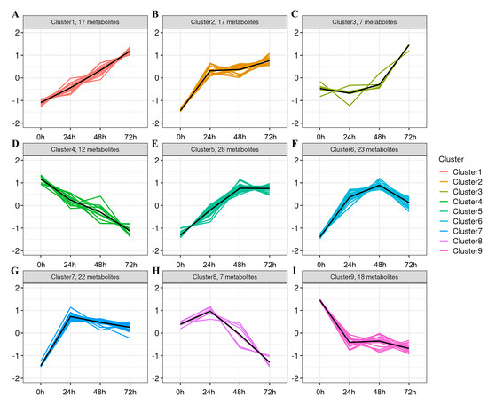 (A–I) Molecular expression pattern plot (each subplot represents a different cluster, with the x−axis indicating fermentation time and the y−axis representing the average expression level of the molecule within each group. Cluster1 Includes 17 metabolites (A); Cluster2 Includes 17 metabolites (B); Cluster3 Includes 7 metabolites (C); Cluster4 Includes 12 metabolites (D); Cluster5 Includes 28 metabolites (E); Cluster6 Includes 23 metabolites (F); Cluster7 Includes 22 metabolites (G); Cluster8 Includes 7 metabolites (H); Cluster1 Includes 18 metabolites (I);).