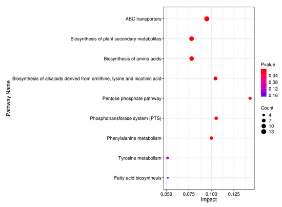 Enrichment analysis utilizing the KEGG database was employed to associate differential metabolites with specific metabolic pathways, identifying significant pathways and assessing their dynamic changes during fermentation. As depicted in Figure 6, the analysis revealed that differential metabolites predominantly influenced nine pathways, encompassing a total of 23 distinct metabolites. Subsequently, leveraging these metabolite-pathway associations, a comprehensive metabolic pathway map was constructed (Figure 7). Numerous differential metabolites affected by K. marxianus KM812 fermentation were identified to participate in ABC transport, as well as amino acid and lipid metabolism pathways. As illustrated in Figure 7, 13 metabolites, such as L-glutamic acid, L-isoleucine, ornithine, cellobiose, mannitol, and D-ribose, were associated with the ABC transport pathway. Metabolites involved in amino acid metabolism, including isocitric acid, L-isoleucine, L-glutamate, and ornithine, were closely linked to the citric acid cycle and various metabolic pathways.