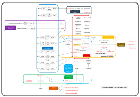 L-3-Phenyllactic acid and D-phenylalanine interconvert within the phenylalanine metabolism pathway, yielding N-acetyl-L-phenylalanine as the final metabolite. D-phenylalanine undergoes conversion into gentisic acid, 4-hydroxyphenylacetaldehyde, (R)-3-(4-hydroxyphenyl)lactate, and 3,4-dihydroxymandelic acid via the tyrosine metabolic pathway. Lipid metabolism pathways primarily involve the transformation of saturated fatty acid octanoic acid into unsaturated fatty acids such as linoleic acid and α-linolenic acid, with the latter further converting to the polyunsaturated fatty acid jasmonic acid. The citrate cycle indirectly influences the fatty acid biosynthesis pathway, involving metabolites such as dodecanoic acid, caprylic acid, and palmitic acid. In conclusion, the fermentation of K. marxianus KM812 enhances the bioactive compounds in fermented whey, optimizes nutrient proportions, and increases whey bioavailability.
