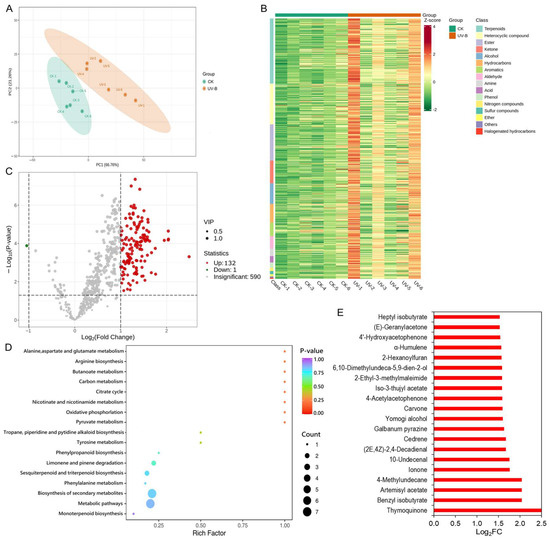 Overview of volatile metabolite changes in A. argyi leaves in response to UV-B radiation. (A) PCA of metabolites. (B) Cluster heatmap of all metabolite contents. The horizontal axis represents the sample name, and the vertical axis represents the metabolite information. Different colors are filled with different values obtained after standardizing the relative content (red represents high content, green represents low content). (C) Volcano plot of DEMs. (D) KEGG enrichment analysis of DEMs. (E) Top 20 upregulated DEMs.