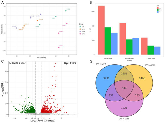 Overview of transcriptome analysis of A. argyi responsive to UV-B irradiation. (A) PCA analysis of samples taken at 0 h, 4 h, 8 h, and 6 days. (B) Changes in the total number of genes and DEGs. (C) Volcano map of DEGs from the pairwise comparison of UV0 vs. UV6d. (D) Venn graph for up- and downregulated DEGs from the pairwise comparisons of UV0 vs. UV4h, UV0 vs. UV8h, and UV0 vs. UV6d.