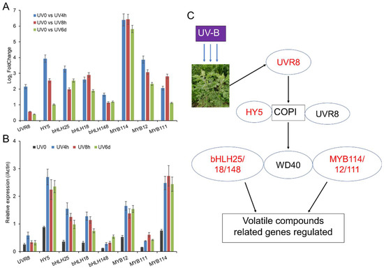 Transcription regulation is one of the main ways of metabolic regulation. Plants are known to respond to UV-B radiation by the signaling transduction module of UV Resistance Locus 8 (UVR8), in conjunction with Constitutively Photomorphogenetic 1 (COP1) and Elongated Hypocotyl 5 (HY5) transcription factors [47,48]. To explore transcription regulators involved in the regulation of volatile compounds, we analyzed the expression of UVR8 signal transduction-related genes in response to UV-B radiation. The expression of UVR8 was significantly upregulated after 4 h of UV-B radiation and upregulated after 4 h and 6 days of UV-B radiation (Figure 6A). Among all the transcription factors examined, only HY5, bHLH25, bHLH18, bHLH148, MYB114, MYB12, and MYB111 were significantly upregulated at three time points. It indicated that the aforementioned transcription factors play a crucial role in the response of A. argyi to UV-B radiation. The results of qPCR confirmed the expression levels of UVR8, HY5, bHLH25, bHLH18, bHLH148, MYB114, MYB12, and MYB111 (Figure 6B), showing the reliability of the RNA-seq data. Increased levels of MYB and bHLH can boost the expression of PAL, C4H, PBS3, and other genes, thereby enhancing the synthesis of secondary metabolites [49,50,51]. As a sensor of UV-B wavelength, UVR8 activity directly affects the expression of key genes in the terpenoid and flavonoid pathways [52]. Based on the above analysis, we proposed a regulation model of volatile compound in A. argyi responding to UV radiation (Figure 6C), in which transcription factors HY5, MYB, and bHLH family members might play a central role. Certainly, the response of plants to UV radiation can also be regulated by non-specific signaling pathways involving defense-induced hormones such as jasmonic acid and salicylic acid [4,10].