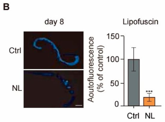 NL extends lifespan and reduces lipofuscin accumulation in C. elegans. (A) Effects of NL on lifespan in C. elegans. Synchronized worms at young-adult stage were treated with 50 μM NL (** p < 0.01, log-rank (Mantel-Cox) test). (B) Effects of NL on lipofuscin accumulation in C. elegans. The scale bar shows 100 μm. ImageJ was used to quantify the fluorescence in the left panel (n = 25 for three independent experiments). Data in bar graphs are expressed as mean ± SEM. (*** p < 0.001, two-tailed Student’s t-test).