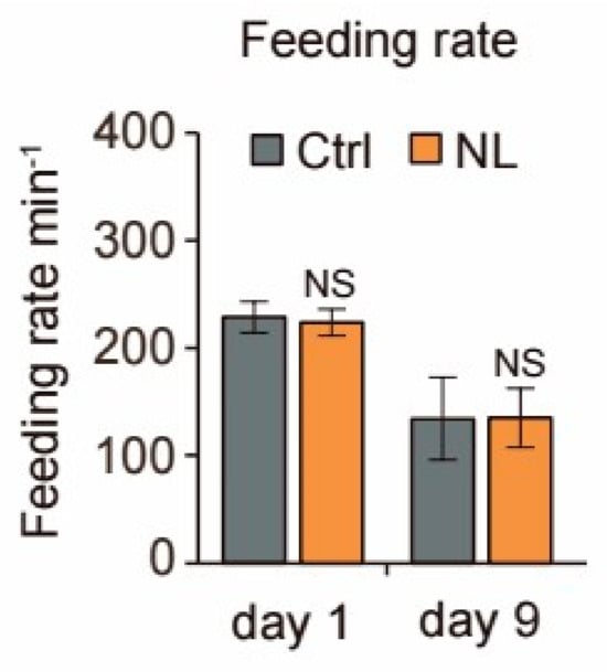 Since NL treatment for the whole-life period of worms could extend worms’ lifespans, the impact from the food intake amount should be in consideration. To eliminate the potential influence of dietary restriction on the lifespan of C. elegans, we examined their feeding patterns. The results showed that there were no significant differences in food intake between the control and NL-treated groups in either 2 days or 9 days (Figure 2), indicating that NL-induced lifespan extension was not related to the diet-restrict pathway.