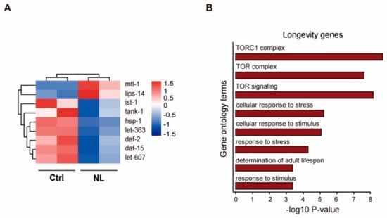 Heatmap and enrichments of GO terms associated with longevity genes altered by NL treatment in C. elegans. (A) Heatmap of significantly altered longevity-related genes after NL treatment. Color correlates with the value of z-score. Z-score = (X − mean)/SD. (B) Significant GO terms of longevity-related DEGs found by enrichment analyses in 50 μM NL-treated worms.