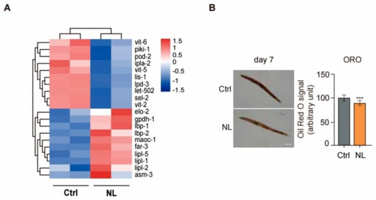 We found that 20 genes in RNA-seq DEGs data were associated with lipid metabolism, as presented in a heatmap (Figure 6A). The heatmap revealed that NL treatment significantly upregulated the expression of genes pivotal to lipid catabolism, including lipl-1, lipl-2, and lipl-5, all belonging to the lipase family. Meanwhile, NL treatment significantly suppressed the expression of genes indispensable for fatty acid synthesis, such as ipla-2 and pod-2. Moreover, the NL treatment decreased the expression of genes related to vitamin metabolism, including vit-2, vit-5, and vit-6. Vitamins are engaged in lipid anabolic reactions as coenzymes or cofactors. Accordingly, the reduced expression of genes engaged in vitamin metabolism may perturb lipid synthesis metabolism, thereby improving lipid degradation (Figure 6A).