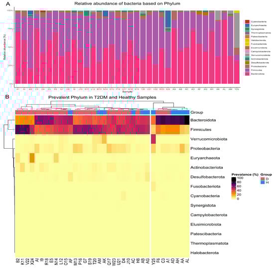 Among the T2DM samples, nine showed a Bacteroidota prevalence of over 50%, while five samples had a prevalence of less than or equal to 30%. The remaining T2DM samples exhibited a Bacteroidota prevalence between 30% and 50%. In contrast, ten T2DM samples showed a Firmicutes prevalence of over 50%, three samples showed a prevalence of less than or equal to 30%, and eleven samples showed a prevalence between 30% and 50%. In the healthy group, eight out of eleven samples showed a Bacteroidota prevalence of over 45%, and five samples showed a Firmicutes prevalence of over 45%. Notably, Euryarchaeota was predominantly present only in T2DM samples, while Verrucomicrobiota was predominantly found in healthy samples. Figure 1A illustrates the predominant phyla in all the studied samples.