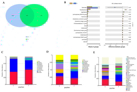 (A) Venn diagram depicting shared and unique taxa between T2DM and healthy individuals. (B) Differential abundance analysis of specific genera between T2DM and healthy groups. The left panel presents the bar graphs depicting mean value of the abundance of the genus in each group. The right panel is the confidence interval of between-group variations. The right-most value is the p-value of the significance test of between-group variation using the t-test. (C–E) Comparative analysis of the relative abundance of top phyla, families, and genera between T2DM and healthy groups.