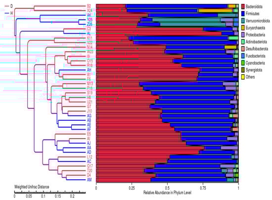UPGMA clustering of samples based on weighted UniFrac distance, with the relative abundance of phyla visualized for each sample. The phylogenetic tree shows the distances between samples, with T2DM samples marked in red and healthy samples in blue. The accompanying bar chart displays the abundance of microbial taxa, highlighting the dominance of phyla.